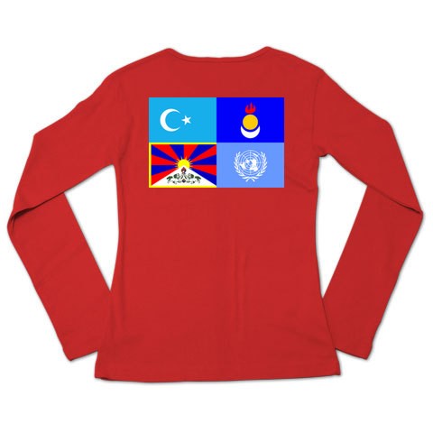 その後、チベット、東トルキスタン、南モンゴル(内モンゴル人民党)の旗と国連旗をデザインしたTシャツを作成。これは、「トップガンで」トム・クルーズが着ていたジャケットの背面のデザインを参考にしたものです。